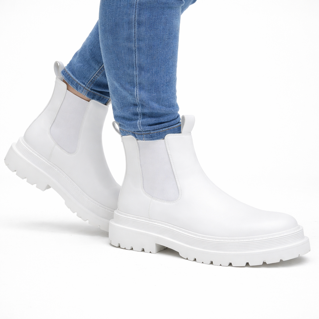 Setze ein modisches Statement mit den Kaeron Chelsea Stiefel mit Plateau und Mid-Calf-Schnitt. Diese Unisex-Boots im Couple-Style überzeugen mit runder Zehenform, elastischen Einsätzen und markanter Plateausohle. Erhältlich in Weiß und Grün verbinden sie modernen Streetstyle mit klassischer Chelsea-Eleganz — perfekt für selbstbewusste Looks.